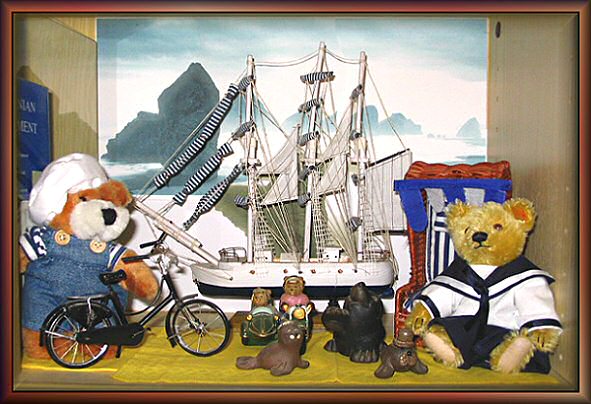 Kellmurpel mit Schmutje in Rudolfs neuer Vitrine. Ihre Abenteuer- und Reiselust sieht man ihnen hier gar nicht an. Der singende Maulwurf und die Seelöwenrentner sind auch zur Schiffsbesichtigung gekommen. Murpel & Oblomow doppelten sich und kamen aus der grossen Vitrine per Motorrad.